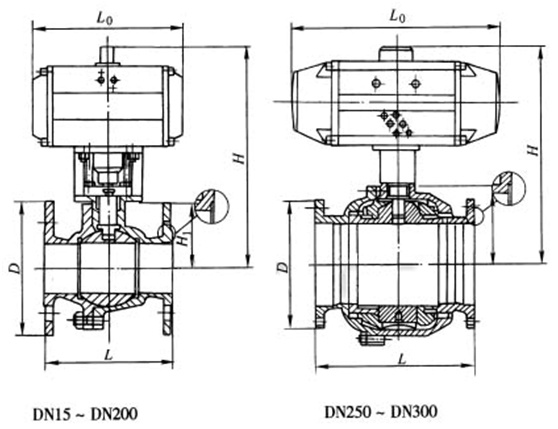 Q641F、Q641Y 型PN16 气动球阀主要外形及结构尺寸(mm) |