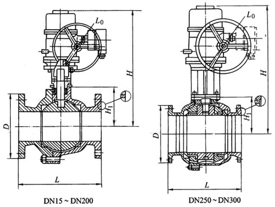 Q941Y 型(PN25) 型法兰连接浮动硬密封电动球阀外形及结构尺寸(mm) |